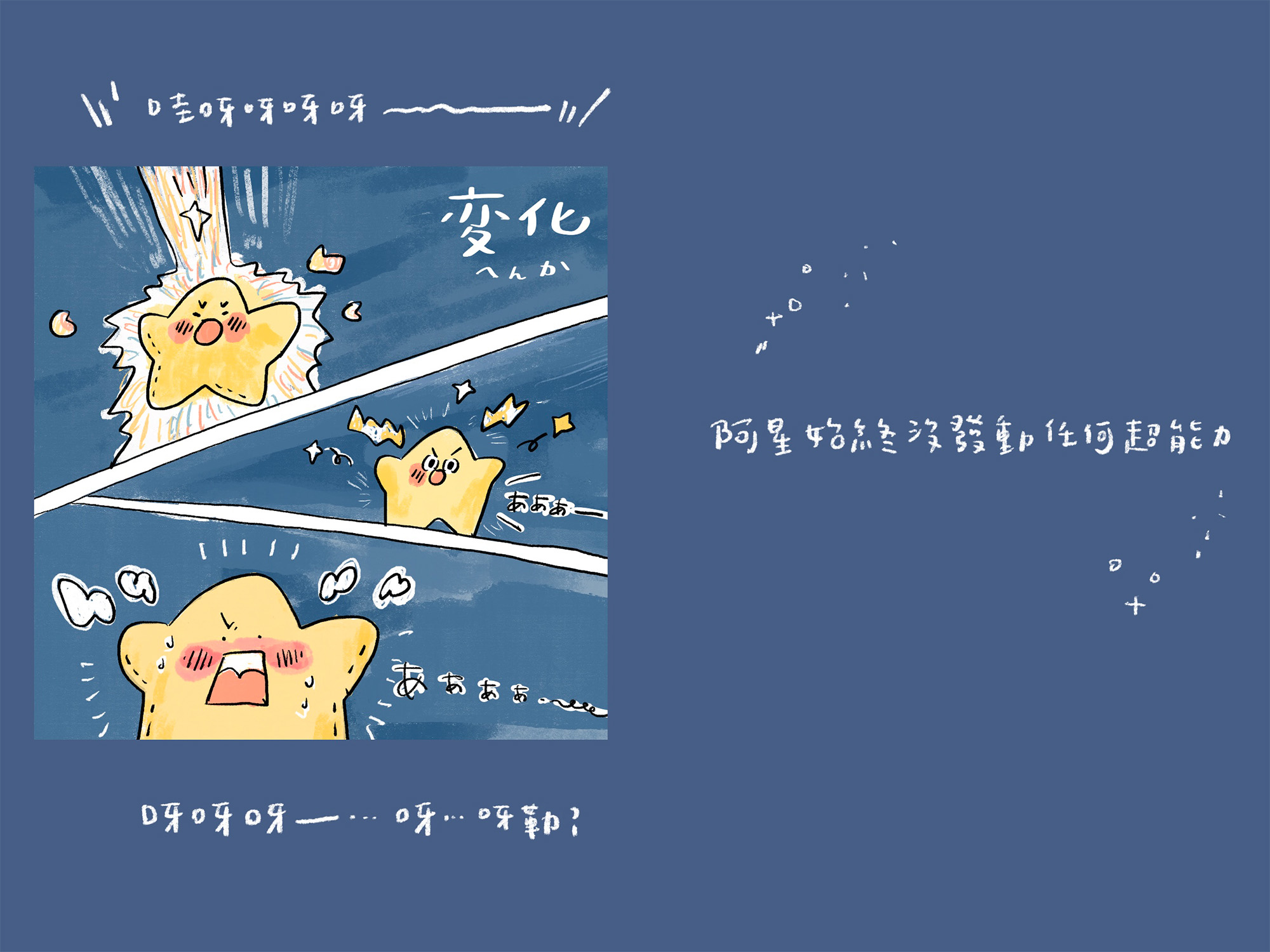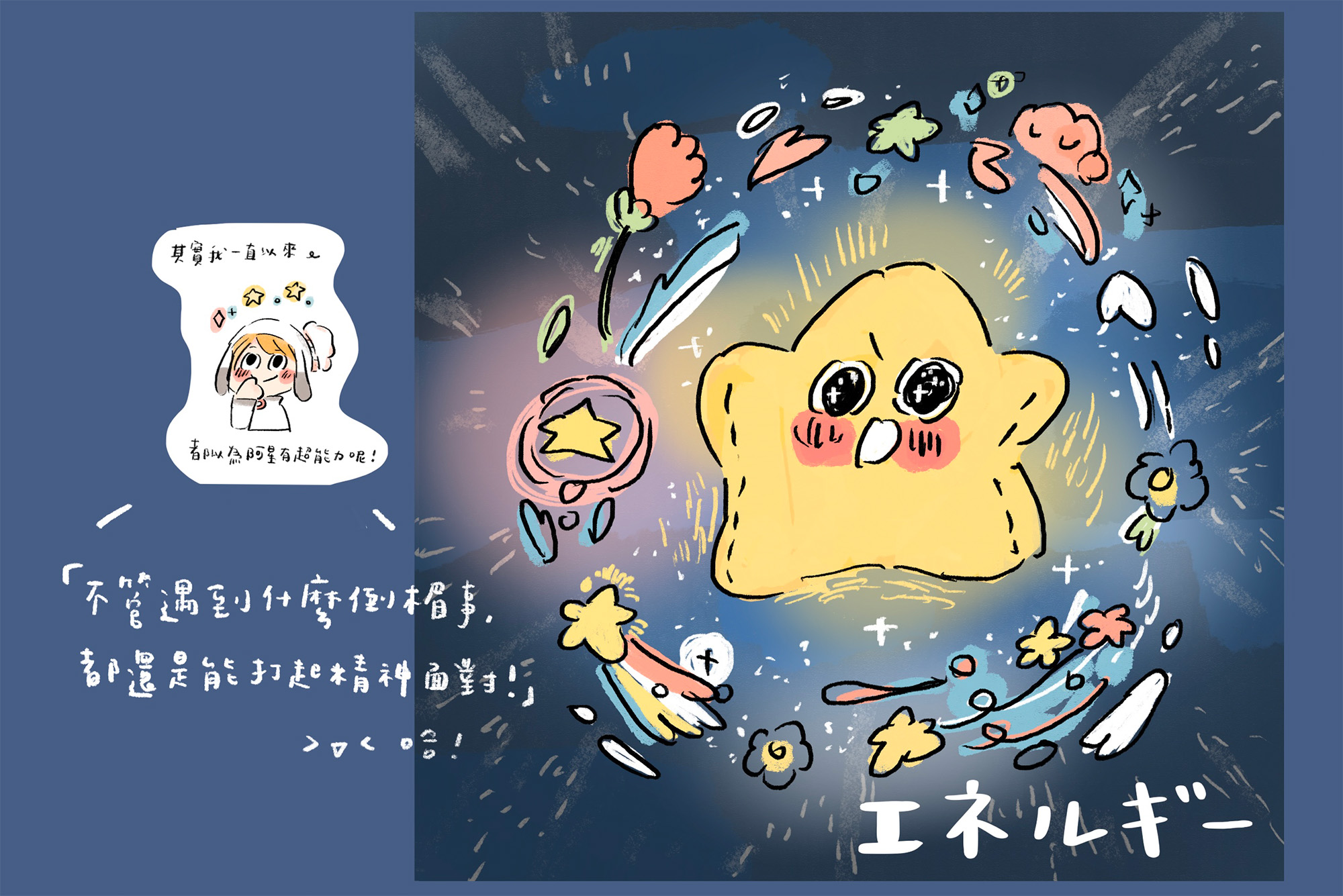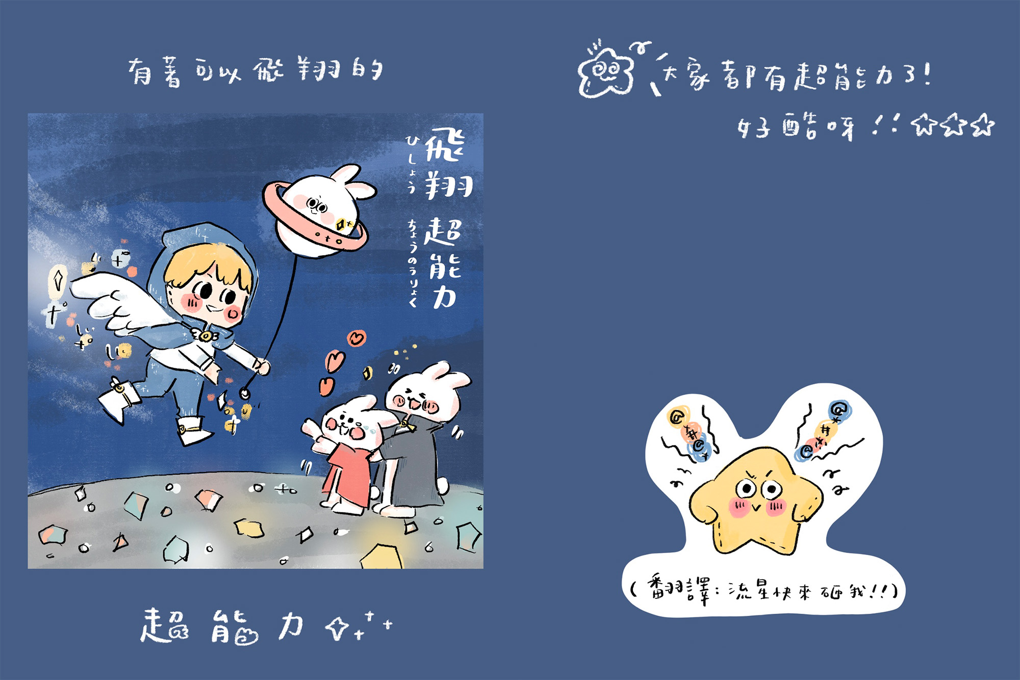 🌟想說的話:阿星最終還是沒因為被流星擊中而產生新的超能力。但在這個探索的過程中,他也發現原來所謂的超能力,其實就像每個人擅長什麼事情一樣。就像有人很會歸納整理,講話一針見血;有人總是活力滿滿,帶給身邊的人很多溫暖;有人有著光速般的執行力,有人如聖母下凡,願意傾聽與陪伴,每個人的優勢,就像超能力一樣啊。其實有時候我們都太低估自己,因為習以為常,所以都不覺得是什麼大不了的,但如果忽略了自己的強項,而無法善加利用的話,感覺是一件超可惜的事。就讓我們一起練習欣賞自己,相信自己比想像中有更多潛能,好好發揮,創造專屬自己的超能力吧!